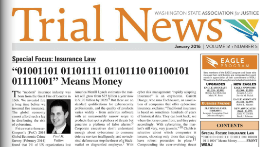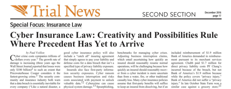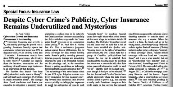Cyber crime costs companies trillions of dollars every year. The growth rate of damage is increasing (three years ago the Wall Street Journal reported that losses were only $ I 00 billion) to such an extent that Pricewaterhouse Cooper considers it the fastest–growing crime. The security community and insurance industry both warn that a data breach is essentially inevitable for every company (“Like a natural disaster, a company cannot completely avoid a cyber attack”). Small businesses are particularly at risk for damage from which they cannot recover . . . . Cyber insurance law is uncharted territory concerning both coverage and claims. The cyber insurance market is too young for insurance attorneys to have a collection useful precedents about cyber coverage . . . . Ultimately, according to Joshua Gold, who chairs Anderson Kill ‘s cyber insurance recovery group, “Despite the breadth of coverage promised by many cyber policies, there is also a lot of untested and nonuniform fine print that some insurers will surely seize upon to challenge claims despite the original intent of the parties.”